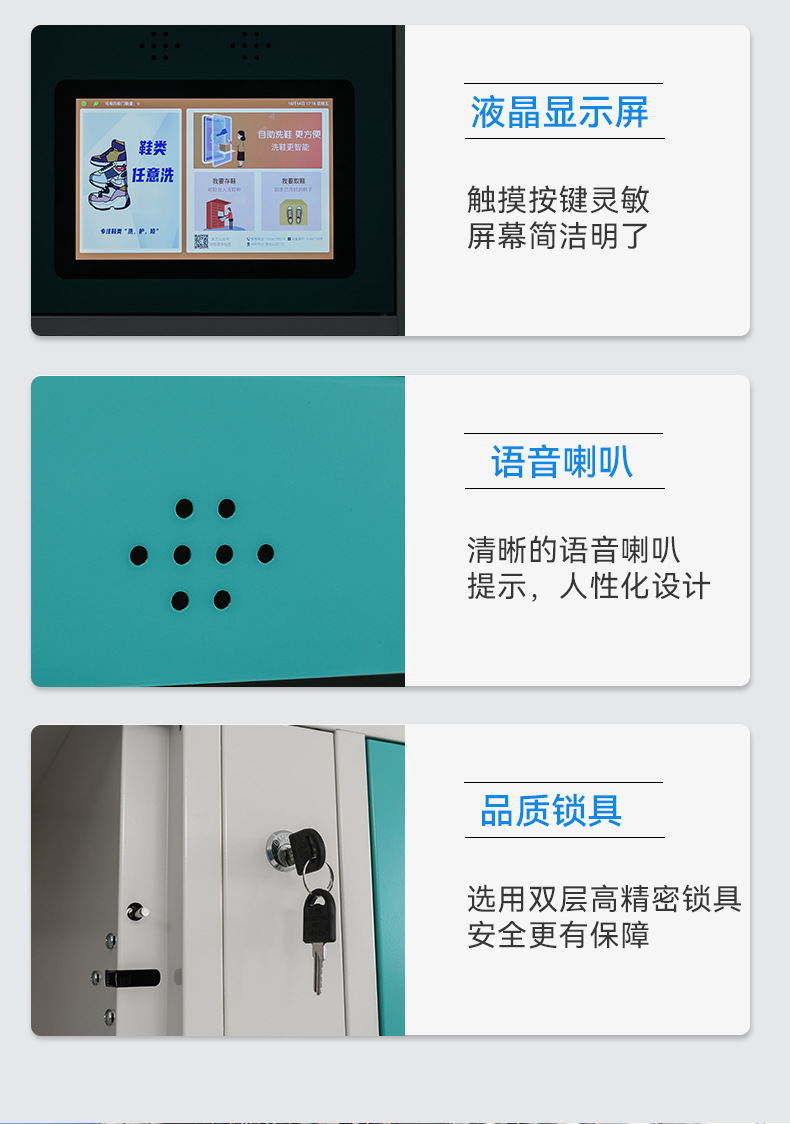 智能洗鞋柜,用戶掃描洗鞋柜,進入存鞋、取鞋、下單三個操作步驟,化繁為簡讓使用更簡潔。